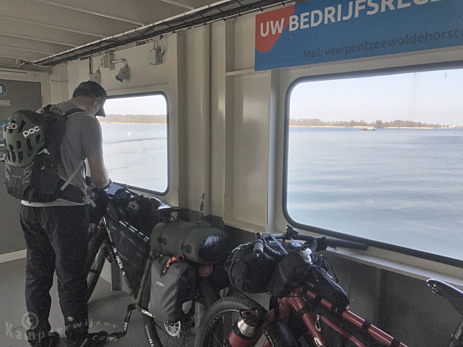 Als we aankomen bij het Horsterveer bij Strand Horst komt de veerboot er net aan. Dat is geluk hebben want die vaart maar eens in de veertig minuten. We kopen retourtjes, die blijven geldig. Eenmaal aan de overkant is het een klein stukje door Zeewolde en het Horsterwold. Ook hier gaat de route weer grotendeels over mooie natuurpaden.