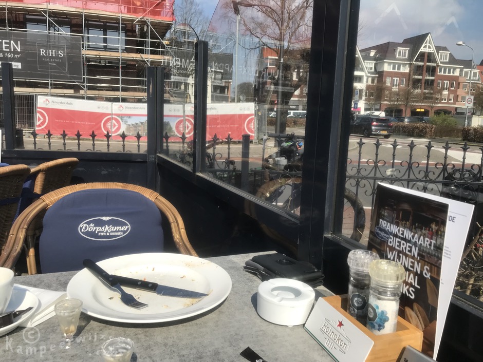 De volgende dag is het wederom zonnig, alleen in de middag betrekt het wat. We hebben weer geluk met het veer. We fietsen bijna dezelfde route terug, als je de andere kant op fietst ziet de wereld er toch anders uit. Alleen stuiten we in Ermelo op een afgesloten spoorwegovergang. Mijn pasje ‘bevoegd spoorbetreder’ ligt helaas thuis, net als mijn gele hesje. Dat wordt omfietsen. Dit heeft als nadeel dat we dwars door Ermelo moeten langs een weg met auto’s maar het voordeel dat we langs een restaurant komen met een zonnig terras en dat precies rond lunchtijd. De uitsmijters en koffie zijn van uitstekende kwaliteit. Onderweg in het bos zien we ook nog een groepje wilde zwijnen met jonkies passeren, op veilige afstand. Wat een mooie en afwisselende tocht.