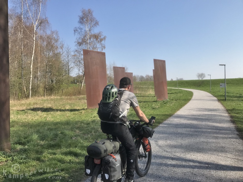We gaan van heideveld naar heideveld. Het fietspad over de Houtdorper- en Speulderveld loopt iets anders dan op onze fietskaart. Dave ziet een salamander te laat op het fietspad. Op de Ermelose Heide is er een attractie waar fietsers in het voordeel zijn. Als je bij een paal een trapbeweging maakt alsof je een fietspomp bediend, krijg je het verhaal te horen over het Romeinse Marskamp uit 170 na Christus dat hier ooit gevestigd was. Een beeld van een Romein markeert deze leuke plek naast het fietspad.
