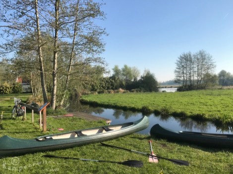 We kampeerden de tweede nacht op natuurkampeerterrein De Landerij in Scherpenzeel, een zogeheten lintdorp. De camping ligt achter een voormalige herberg aan de doorgaande weg, wat ook zo ongeveer de enige weg is in Scherpenzeel. ’s Avonds liepen we nog even langs deze rustige weg richting de kerk. Maar dit zijn niet de contreien waar je een kroeg vindt naast de kerk. We vonden de weg en de bebouwing deprimerend. De echte schoonheid van Scherpenzeel bleek achter de camping te liggen: een smal schelpenpaadje over dijkjes langs het water van het veengebied. Hier liggen ook kano’s die je gratis mag lenen als je hier kampeert.