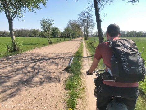 Nu we op een mountainbike fietsen hebben we een nieuw adagium: het gaat niet om kilometers maar om tijd. Of je in vier uur nu veertig kilometer aflegt of tachtig, je bent lekker vier uur onderweg met de fiets. Wij denken zelfs dat we meer van het landschap genieten nu we minder kilometers afleggen. En wat een prachtig landschap het was, waar we doorheen reden. We dachten alles al fietsend gezien te hebben van Nederland maar dit hoekje hadden we weten te missen. Dat heeft ook te maken met de nieuwe fiets. Hiermee ‘we boldly go, where no velomobile has gone before’.