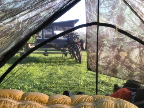 Het was een schitterend zonnig weekend, overdag 21-23ºC en ’s nachts tussen de 5-9ºC. We sliepen weer in de Zpacks Triplex-tent. We testten verschillende gevriesdroogde ontbijtjes en een nieuwe quilt van Therm-a-Rest, de Vesper 32ºF/0ºC, in combinatie met drie verschillende slaapmatten (en ja, dat zeulden we allemaal extra mee op de fiets). Maar daarover weer een andere keer.