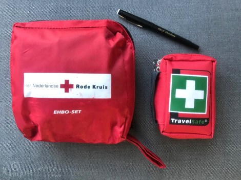 Een uitgebreide EHBO-set is zo’n ding dat je altijd meesleept maar zelden nodig hebt. Gaat je reis door echt afgelegen gebieden of kan je een alarmnummer bellen? En als je echt een EHBO-doos nodig hebt, dan ga je het heus niet redden met die paar gaasjes en dat minirolletje verband die je in zo’n klein EHBO-reistasje kunt vinden. Met zo’n schaartje erbij dat niet knipt. Middelen voor een drukverband kan je er meestal niet eens in vinden, terwijl die nu juist nodig zijn in een situatie die je wilt oplossen voordat de hulpdiensten er zijn. Voor kleinere wonden geldt: je kan altijd nog een zwaluwstaart of een spalk maken met behulp van ducttape. Alles wat ernstiger is dan wat gefixt kan worden met een pleister, daar moet toch zo snel mogelijk professionele hulp bij komen. Wondjes die klein genoeg zijn voor een pleister, daar hoeft eigenlijk niet eens een pleister op. En is het je ooit gelukt een teek te verwijderen met een tekentang? Mij niet. Iedere keer wordt de kop gescheiden van de romp want die krengen laten niet los. Dus moet je ‘m toch uitkrabben met je nagel.