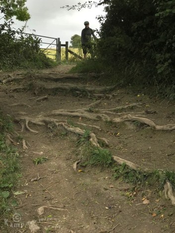 Op de route moeten we door ontelbare hekken. Want de South Downs is vooral agrarisch land. In plaats van wildroosters plaatsen de Engelsen hekken. Bij het onhandig afstappen bij een van die hekken is mijn sok aan de spijkertjes van mijn pedaal blijven hangen en er zit nu een groot gat in. Bij een van die hekjes ben ik ook een keer omgevallen. De grond is hier zo oneven, en bleek even wat verder weg dan waarop ik had geanticipeerd! Mijn kleren zitten onder de modder (en zweet).