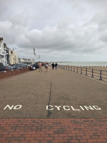 Nu we het bandprobleem onverwacht snel hebben kunnen fixen, hebben we tijd om de stad te bekijken. Het is een mooie stad maar wel vergane glorie. We bezoeken de houten pier, die gratis toegankelijk is. Er is veel volk op de been vanwege de luchtshow. Bij Wilko’s scoren we een half litertje paarse spiritus voor onze brander. Verder kopen we voor Dave een nagelknipper, hij was deze vergeten mee te nemen. Ik vind een nieuwe minitube met tandpasta. Veel meer valt er voor ons niet te shoppen, er kan toch niets mee op de fiets.