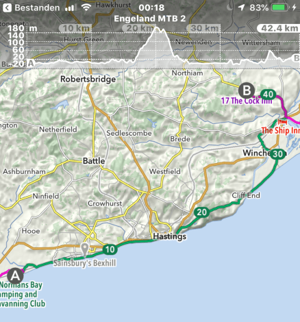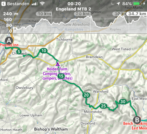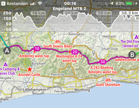 Eten hebben we weer voor vier dagen bij ons, zodat we vanaf de South Downs niet hoeven af te dalen naar dorpjes of stadjes met een supermarkt, wat vele extra kilometers en hoogtemeters zou inhouden. Van thuis hebben we alles lekker compact meegenomen in de vorm van maaltijden van Adventure Food. We vullen in het hotel onze bidons met het water uit de kraan. Dat smaakt naar weer naar zwembadwater, een van de mindere dingen van vakantie in Groot-Brittannië.