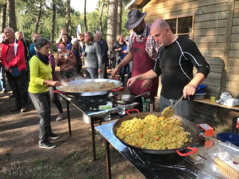 Je moet een beetje op onderzoek met je eigen bord en spork in en rond het groepsgebouw maar dan vind je een waar feestmaal. Er is van alles te verkrijgen. Notenrijst, diverse soorten soep, waaronder een heerlijke Thaise kippensoep, sushi, gepofte aardappels met spinazie en gorgonzola, saté met pindasaus. Het toetje bestaat uit poffertjes, ijs en bessen. Zoveel keuze en het is allemaal heerlijk. Er staat bier, wijn en fris en ondertussen gaan er ook nog schalen rond met bitterballen, mini kaassoufflés en andere hapjes. Waanzinnig.