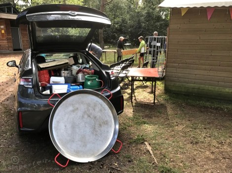 Uiteindelijk staat dus iedereen gewoon op het groepsveld, op wellicht wat personen na die nog een individuele plek hadden geboekt bij de camping. Wat een prachtige camping overigens, midden in het bos. Wij zetten onze tent strategisch uit de rook van het kampvuur op en gelukkig bleef de wind uit dezelfde hoek waaien.