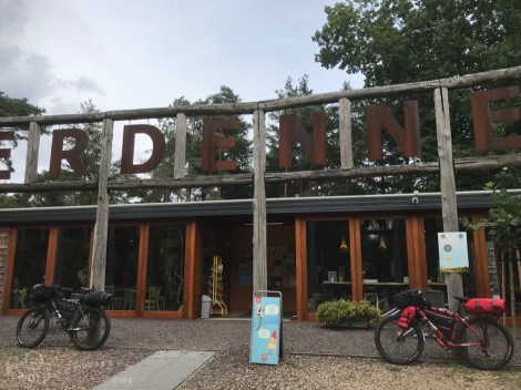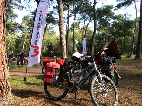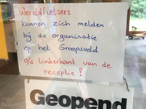 Bij de receptie van de Harskamperdennen hangt een briefje aan de deur: “Wereldfietsers kunnen zich melden bij de organisatie op het Groepsveld aan de linkerkant van de receptie”. Als we aankomen op het veld meldden we keurig dat we te-laat-aanmelders zijn. Maar we mogen onze tent gewoon op het groepsveld opzetten. Er wordt dit weekend regen verwacht en veel wereldfietsers blijken daar niet van te houden en hebben afgezegd (degenen die graag in Afrika fietsen?).