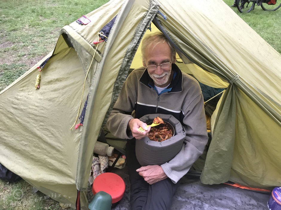 HKD19-berts-pot-cozy Gepubliceerd 12/09/2019 at 940 × 705 in Feesten met de Wereldfietser ← Vorige Volgende → Bert voor de tent met een zelfgemaakte maaltijd Man met voedsel, zittend in tentopening