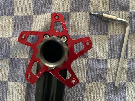 1. Het is het makkelijkste om meteen de buitenste ring met tanden op de spider vast te schroeven. De schroeven die in kleur worden meegeleverd zijn zelfborgend en hiervoor heb je dus geen Loctite nodig. Het kettingblad past maar op één manier op de spider, anders komen de gaten niet uit. Zie ook de stip op de ring en een van de vijf uitsteeksels van de spider als indicatie. Ook hier schroef je in aan de binnenkant.