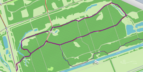 We maakten een wandeling van 5,3 kilometer. De auto parkeerden we op de Knardijk. We liepen in het stuk bos dat is omsloten door Knardijk, Lage Vaart en de Torenvalkweg. De wandeling is makkelijk uit te breiden naar de andere kant van de Knardijk en/of Torenvalkweg.