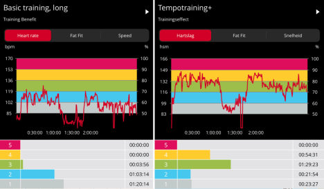 Polar houdt vijf trainingzones aan. De meeste trainingprogramma’s en apparaten gaan uit van 5 of 6 zones die hiermee overeenkomen. Zie de kleuren in de tabel hieronder overeenkomen met de screenshots hierboven.