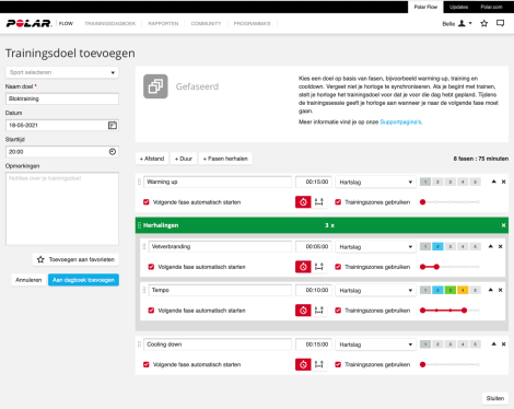 In het trainingsdagboek kan je ook zelf een training ontwerpen. Hier is het mogelijk om duurtrainingen of intervaltrainingen naar wens aan te maken. Deze kan je synchroniseren met een Polar horloge.