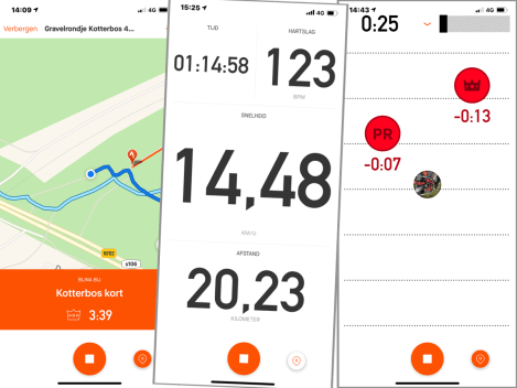 Tijdens navigatie is het behoorlijk vervelend als je op een zogeheten ‘segment’ terecht komt. Het scherm verandert dan om te zien hoe je scoort ten opzichte van je persoonlijke record (PR) en degene die de KOM te pakken heeft op dat segment (degene die dat fictieve stukje racebaan het snelste heeft afgelegd). De kaart is dan opeens uit beeld en dat kan in lastige verkeerssituaties voor problemen zorgen. Sowieso is de kaart niet erg gedetailleerd en heb je 4G nodig voor navigatie (kost batterijen).