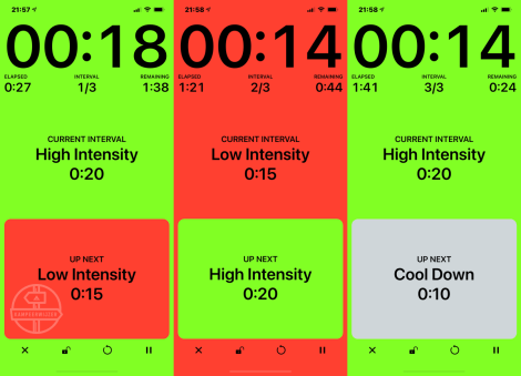 Interval Timer – Seconds (Android / iOS)is een vergelijkbare app als IntervalTimer met dit verschil dat de kegeltjes in je netvlies overstuur kunnen raken.