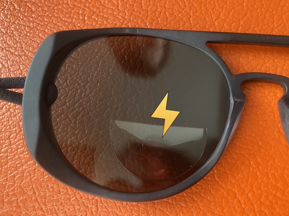 De test met wordt herhaald met een andere zonnebril, een Endura Stella. Ook hier hetzelfde resultaat: de lenzen laten los aan de bovenkant. Wellicht dat hydrostatische hechting wel kan werken op brillen zonder dampwerende coating.