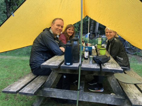 Al snel bleek dat we het kamperen gelukkig niet verleerd waren. De routine zat er nog helemaal in. Wel had ik zoiets van: mijn toilettas moet in de tent, niet in de fietstas blijven. Maar waarom ook alweer? Oja: oordopjes en muggenspray zitten daar in. En wipes en deo om je ’s ochtens mee op te frissen (douchen doen we na het fietsen).