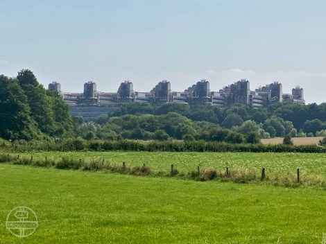 Later zien we een voor ons bekend gebouw opduiken in het landschap. Het is de Uniklinik RWTH Aachen. Dit ziekenhuis en monument zagen we eerder op onze fietsvakantie in 2008, toen we via de LF-route langs de Maas waren afgezakt naar Maastricht en naar Aken fietsten.