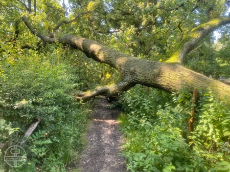 Na Heerlen komen we in het Imstenraderbos. Hier blijkt de route weer gesaboteerd. Zelfde gedonder als gisteren: meerdere boomstammen, om de 30 meter neergelegd en ook aan de zijkanten, zodat je er niet omheen kunt rijden.