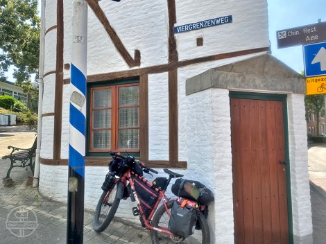 Nu we over asfalt fietsen, komen we ook langs de Viergrenzenweg, die ik herken uit een leuke video van de Tim(e) Traveller. Het heet Viergrenzenweg, omdat hier ooit een neutraal gebied lag dat Moresnet heette. Destijds was het ’t enige vierlandenpunt ter wereld, al was Moresnet niet een echt land maar een zogeheten condominium. Over deze geschiedenis gaat deze grappige video: