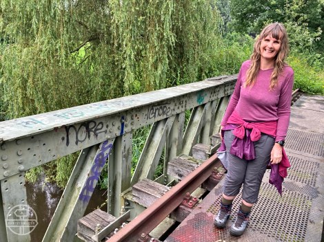 Na het eten gaan we even wandelen voor mijn rug. Al snel blijkt weer dat je al wandelend veel meer ziet dan op de fiets. Het blijkt dat we vlak voor de camping op de fiets langs het voormalige treinstation Liempde zijn gekomen en het voormalige ‘Duitse lijntje‘ hebben gekruist. In de jaren ’30 was dit een spoorlijn waarmee de elite van Londen naar Rusland kon reizen, zo lezen we op de borden bij de voormalige spoorwegovergang. Het lijntje is tegenwoordig een wandelpad. We lopen een klein stukje tot we op de spoorbrug over de Dommel staan.