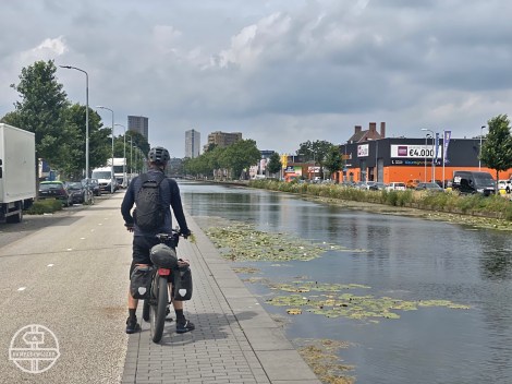 Ook voert de route door de stad Eindhoven. We rijden de stad binnen langs een kanaal. Twee easy riders met bijbehorende muziek halen ons in op elektrische choppers met een hoog stuur. Misschien iets voor ons als we te krakkemikkig worden om nog te fietsen. Ik bedenk er meteen zo’n leren jack bij met van die slierten aan de mouwen. Born to be wild…