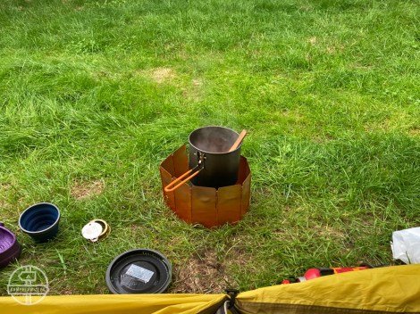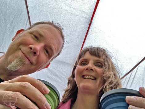 Tijdens het koken valt er lichte regen. We zijn nu blij met onze Sierra Designs Flash 3-tent want in deze tent kunnen we naast elkaar zitten in de tentopening en blijven we droog dankzij een kleine luifel. We houden van deze tent omdat deze geen voortenten heeft. Jammer genoeg is het ontwerp niet op tijd aangeslagen, het is niet meer te koop. Maar veel mensen die onze tent zien willen er meer over weten.