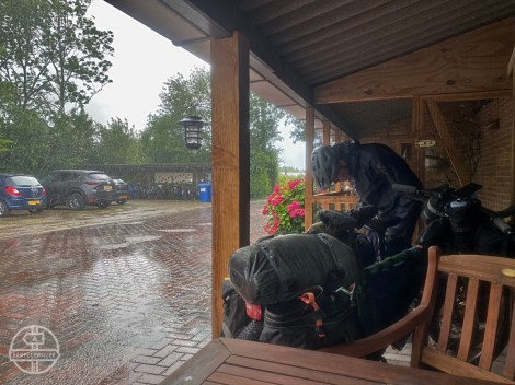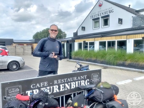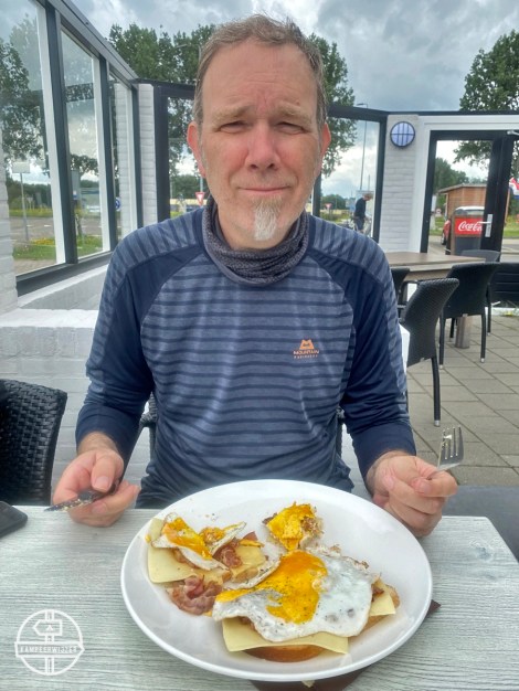 We eten een uitsmijter bij chauffeurscafé-restaurant Treurenburg, hier zijn douchegelegenheden voor vrachtwagenchauffeurs. De naam is toepasselijk, je kunt er niet rookvrij zitten dus zitten we buiten op het natte terras. Maar het eten komt snel en is goed.