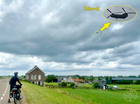 Tot drie keer toe vliegt er een Chinook over, de derde keer besluit ik er dan maar eens een foto van te maken. Naast de weg zien we borden die aangeven dat hier een militair oefenterrein is.