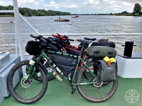 De Lek steken we over met een gierpont bij Beusichem. Die maakt voor de snelheid niet meer alleen gebruik van de stroming voor de voortbeweging. We warmen onze achtersten op het deksel van de machineruimte. We herkennen de omgeving omdat we hier eerder zijn geweest tijdens een fietstocht met de ligfietsvereniging.