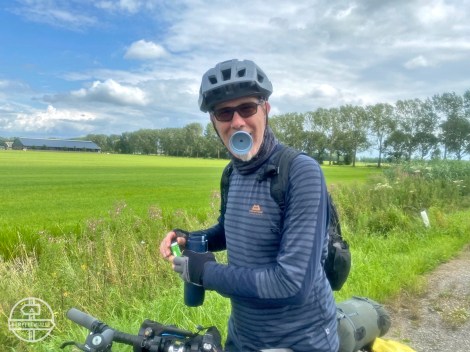 Deze ochtend waren we nog later dan laat op pad. Door m’n rug gaan allerlei handelingen langzamer. We hadden ook helemaal nog niet nagedacht over dat dit wel eens de laatste nacht van de vakantie kon zijn. Ik had een nieuwe route gemaakt in Komoot, profiel wielrennen, want de Oeverlandroute bleek a) niet heel bijzonder en b) was vooral een oeverloze route. Dat kronkelen is leuk als je de wind níet mee hebt, dan heb je ‘m soms nog wel mee. Maar wij hadden de wind wel mee, en hoe. De wielrenroute was daarbij 45 kilometer korter, voor ons een dag minder fietsen. Nog maar 115 kilometer naar huis.