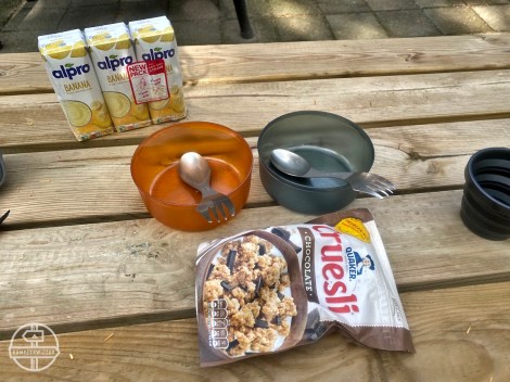 Het is niet alsof we laat waren gaan slapen, integendeel. Onze avondroutine is vrij simpel: binnen vijf minuten is de tent opgezet, daarna bed klaarleggen zodat de vulling in de quilt kan uitzetten en deze nog wat kan uitdampen van de avond ervoor. Spullen in de tent leggen die je daar wilt hebben, zoals je DEET, oordoppen, de plaszak en een lampje. Dat gaat snel, want die dingen zitten bij elkaar in een zakje. Dan koken, eten, afwassen en tanden poetsen. We wisselen met elkaar de foto’s uit die we die dag gemaakt hebben. Vervolgens gaat Dave zijn boeken lezen op de e-reader en schrijf ik in een notitieboekje ons reisverslag van die dag. Ook maak ik een dagverslag aan in Polarsteps, zodat een paar volgers weten waar we zijn en wat we aan het doen zijn. Als ook de ‘pyjama’ aangetrokken is (lang ondergoed van zijde of merinowol) lees ik vaak nog even kort in mijn boek. Deze vakantie was dat ‘De meeste mensen deugen’. Omdat ik veel tijd kwijt ben aan schrijven, lees ik op vakantie één boek en Dave er elf. Omdat het gisteravond licht regende lagen we al om half tien op één oor.