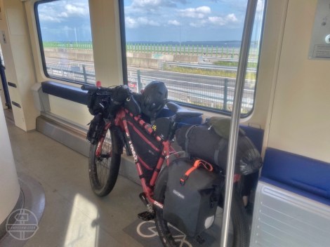 Op Almere Centraal is er een verrassing: het station wordt verbouwd en daarom zijn er tijdelijk geen liften meer. Ook is er geen goot voor een fiets langs de trap. Met mijn rug en Dave’s liesbreuk is de fiets en bagage de trap afslepen echt geen optie. We stappen weer zonder reservering op een volgende trein naar Almere Buiten want die vertrekt al vier minuten later. Almere Buiten heeft een helling die het altijd doet, in tegenstelling tot een lift. Tot ons afgrijzen blijkt de hellingbaan in Almere Buiten niet meer te bestaan en te zijn vervangen door een lift. Die het gelukkig wel doet. Maar waarom niet en-en, beste ProRail? Waarom kosten maken om een helling te verwijderen? Poortjes stonden er al.