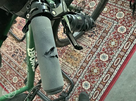 De ESI grip extra chunky op mijn linker inner bar-end van mijn Denham-stuur is opgeschoven en dat betekent dat het stuur ook een flinke klap heeft gehad. Dave heeft het gecheckt op breuken of scheuren. Er is moeilijk aan te komen dus we besluiten om het niet te vervangen.