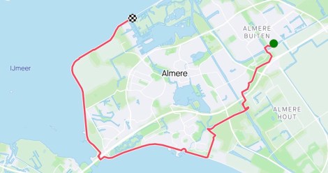 We reden een rondje over de dijken. Een tochtje van bijna 46 kilometer vanaf huis, waarbij we bij de manege Belle Epoque in Almere Haven de dijk beginnen te volgen langs Almere Haven, Marina Muiderzand, Noorderplas, Blocq van Kuffeler en dan langs de Oostvaardersplassen weer richting huis. Een prachtig rondje langs de randmeren en het Markermeer, waarbij we ook nog de Lepelaarsplassen te zien krijgen.