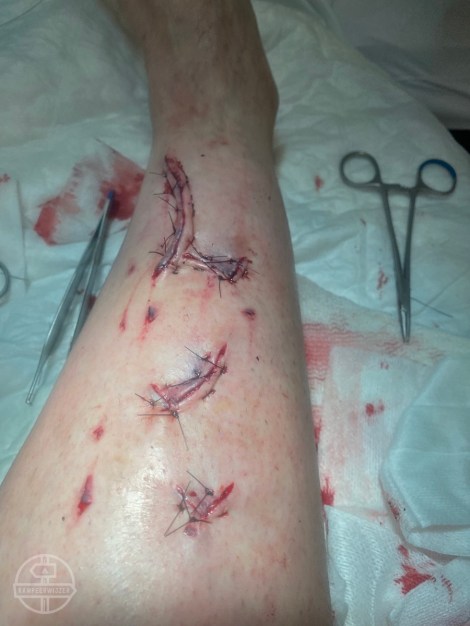 Vooral bij de winkelhaken is het hechten lastig. De eerstehulparts wordt erbij geroepen om te kijken of er huid mist. Het blijkt alleen opgestroopt. Met een soort pincet wordt het weer op zijn plek getrokken. Dave vraagt nog of er dubbel gehecht gaat worden, dus ook onderhuids, maar dat is dit keer niet nodig. De huid op mijn onderbeen staat erg strak, er zijn wat zorgen of de hechtingen zullen houden. Ook wordt getwijfeld of de huid op sommige plaatsen gered kan worden. Als het afsterft, dan worden de littekens lelijker en duurt het helen langer. Het advies is om mijn been niet te buigen en mijn voet haaks te houden. Ik slaap daarom nu voorlopig met een schoen aan.