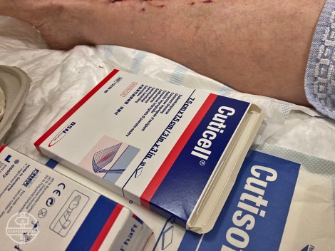 Een vriendelijke vrouw met een Oekraïns accent (HAIO, huisarts in opleiding) is een vol uur bezig om mijn wonden te hechten. In Oekraïne was ze hartchirurg, ze is door de liefde in Nederland terecht gekomen en heeft inmiddels twee kinderen. Ze ziet vaker mountainbikers met altijd dit soort wonden op het onderbeen.