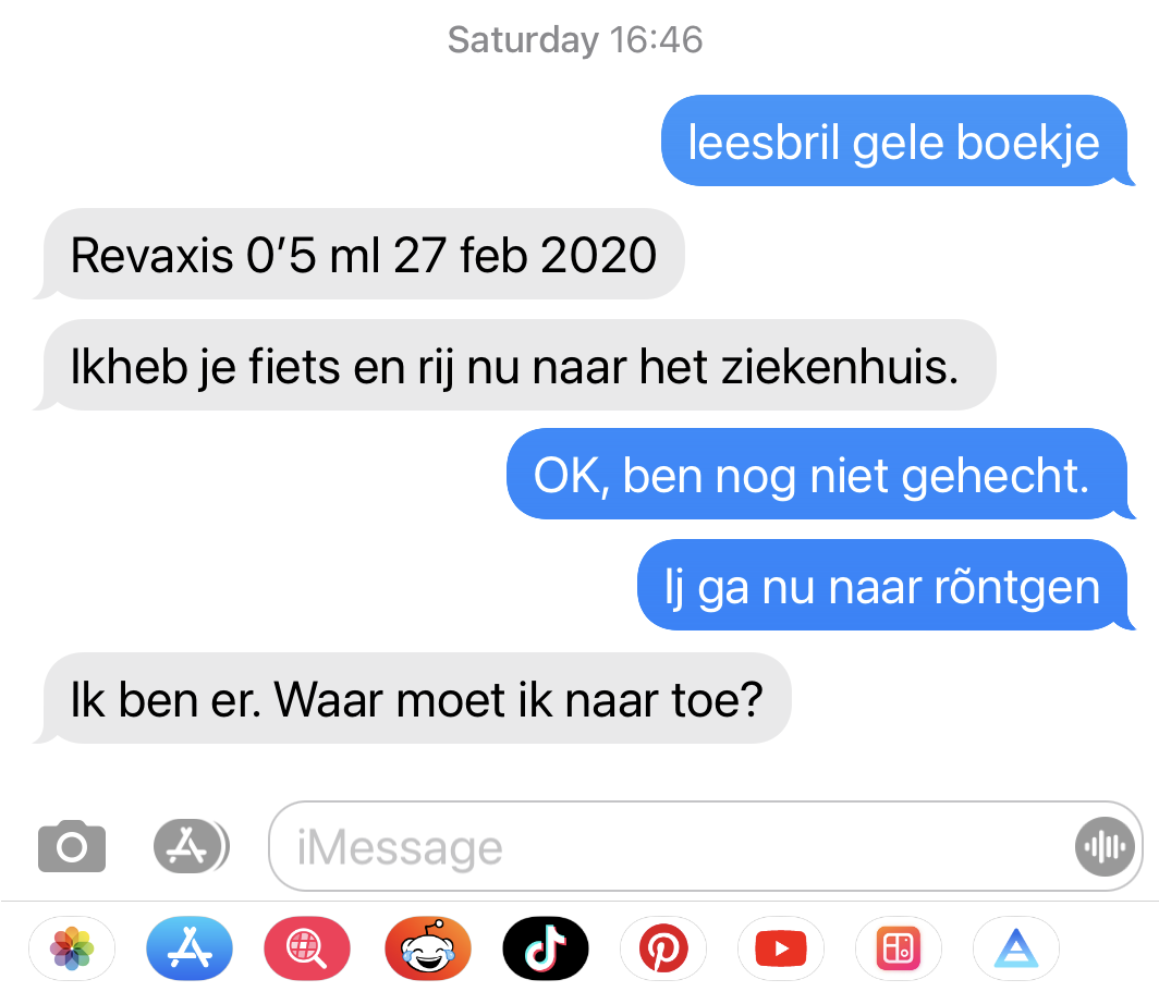 imessage-berichten Gepubliceerd 29/09/2021 at 1064 × 922 in Pijnlijk perikel met pinnige pedalen ← Vorige Volgende → iMessage berichten die we die dag uitwisselen, ik had geen leesbril: rõntgen