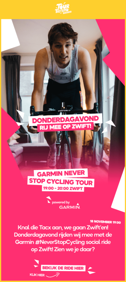 De social ride in Zwift wordt gehost door Garmin Nederland met Bas en Josse van Tour de Tietema. Inmiddels zijn er al 1008 inschrijvingen voor de tocht. Wellicht leidt dit tot een mooie samenwerking met Zwift en komt er in de toekomst meer. Wij hopen op trainen in Zwift met coach Wilbert en natuurlijk virtuele Tour de Tietema wieleroutfits!