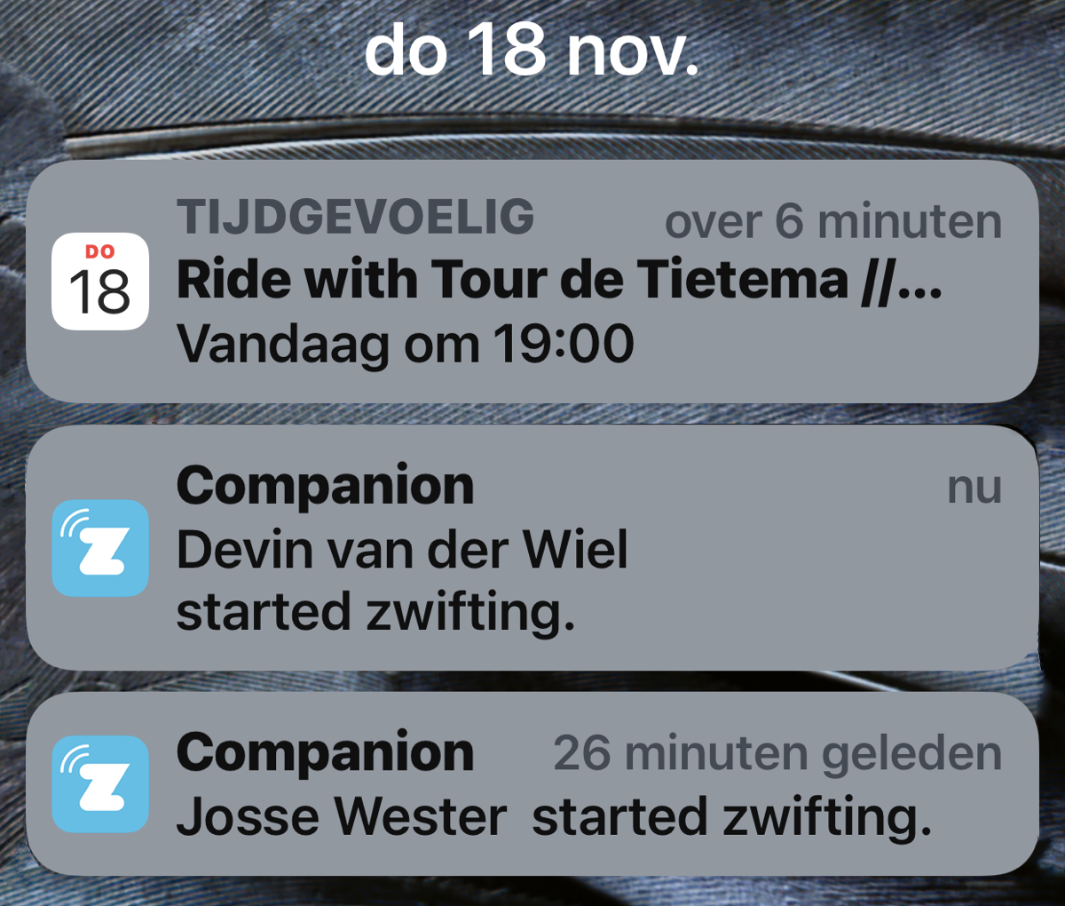 tdt-zwift-companion Gepubliceerd 19/11/2021 at 1200 × 1020 in Verslag social race Tour de Tietema ← Vorige Volgende → Aankondigingen op de iPhone