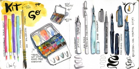 Ook als je lichtgewicht reist houdt niets je tegen om in elk geval een potlood mee te nemen en knipsels achterin in je notitieboek te bewaren. Schetsen kan je later uitwerken en inkleuren. Of je houdt het bij potlood- of pentekeningen.
