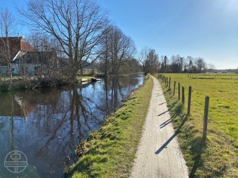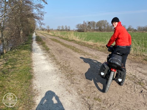 Het landschap kon Dave niet zo bekoren, het deed hem teveel denken aan de Flevopolder. Maar dat was vooral vanwege de wind en omdat hij met dit weer liever hoog en droog op de zandgronden van de Veluwe wilde kamperen. In het verleden hebben we niet zo’n goede ervaring opgedaan met kamperen in weilanden bij lage temperaturen omdat het vaak erg vochtig is en daardoor extra koud. Dave had daarom kritiek op de reisplanning. Door de kronkelende dijkjes, de historische dorpjes en oude kerkjes vond ik de vergelijking met de Flevopolder nogal mank gaan maar Dave ploeterde tegen de koude wind in met een zere knie, mij uit de wind houdend, dus had recht op wat sacherijn.