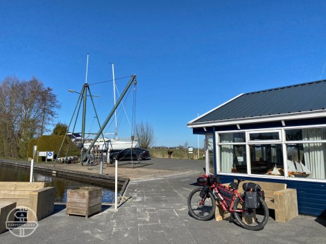 In het Friese land langs onze route waren weinig horecagelegenheden te vinden. Ik had de route langs eetcafé ’t Slûske bij jachthaven Sneekerhof aan het Sneeker meer laten lopen. Naar verwachting kwamen we hier rond lunchtijd langs. Die verwachting kwam uit maar helaas was het café zo te zien voor langere tijd dicht. We konden hier water tappen in het toiletgebouw van de jachthaven.