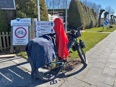 Het ging dankzij de wind als een speer. In Langezwaag hadden ze bedacht dat bij het kruisen van een grote weg het handig was om van die zigzag hekjes neer te zetten aan beide kanten van de weg. Handig voor automobilisten, niet voor fietsers. In onze ervaring ben je meer met het sturen door die hekjes bezig dan met het kruisende verkeer. Maar nu pasten we er met onze kleine fietstassen (formaat voortassen) er alleen lopend doorheen. Iemand met een trike, bakfiets, velomobiel of een kinderkar achter de fiets heeft hier helemaal het nakijken. Dave had de pech op deze plek door een hele grote natte hondendrol te rijden met zijn band. Ook dat nog, Langezwaag! De spetters kwamen zelfs tegen de tent aan het stuur.