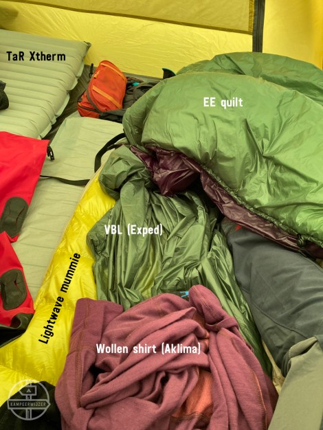 We hadden ervoor gekozen om deze keer niet onze winterslaapzakken mee te nemen maar om te testen of onze donzen zomerslaapzak in combinatie met onze synthetische quilts1 ook een goede combi zouden zijn. We sliepen heerlijk warm op onze Therm-a-Rest NeoAir Xtherm slaapmatten. Dave had nog onder de mat een lange zilverkleurige dunne mat gelegd. Van hetzelfde materiaal, dat ook voor autoruiten wordt gebruikt, hebben wij ook zitmatten gemaakt. Deze zitmat had ik onder de slaapmat ter hoogte van mijn torso gelegd. Ik denk niet dat het echt nodig was. We hebben heerlijk warm geslapen.