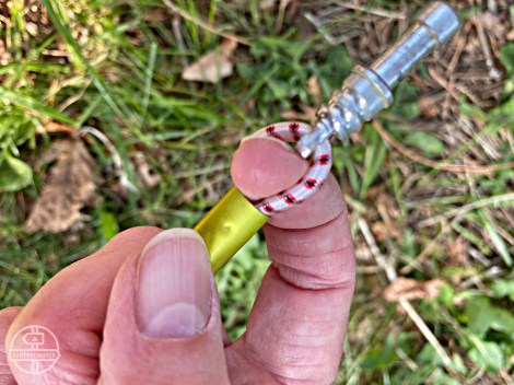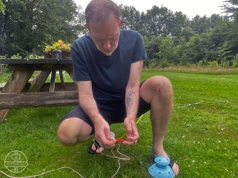 Aan de andere kant van de stok breng je het elastiek op spanning en vervolgens gebruik je een klem om het elastiek op spanning te houden. Knip het elastiek ongeveer tien centimeter langer af, smelt het uiteinde en knoop het vast aan de afdichting. Vervolgens verwijder je de klem. Bij het MSR elastiek dat wij hebben gebruikt zit in de verpakking een plastic klemmetje maar het raakt makkelijk los. Een griptangetje werkt waarschijnlijk beter.