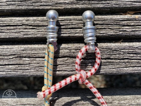 Bij het eind knoop je het stokeinde of dopje vast. Vanwege de beperkte ruimte in de stok kan je hiervoor waarschijnlijk geen achtknoop gebruiken. De knoop die hiervoor gebruikt wordt is een slipsteek. Dit is een heel eenvoudige knoop. Je maakt een overhandse halve knoop en daar rijg je het uiteinde nog een keer doorheen. Wanneer je de knoop goed hebt aangetrokken voelt het een beetje eng, want het is een slippende lus. Maar wanneer je het uiteinde naar beneden in de stok hebt zitten, schuift de lus niet meer. Als je het niet vertrouwd kan je de knoop een beetje vastsmelten met de aansteker. Zorg ook dat je het uiteinde van het elastiek even heet maakt met behulp van de aansteker, zodat de polyester mantel van het elastiek niet gaat rafelen.