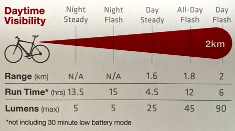De oplaadbare Flare RT gaat in de stand ‘all day flash’ twaalf uur mee en is zichtbaar vanaf 1,8 kilometer. Er is ook nog een fellere stand die het zes uur doet, waarbij het knipperlicht vanaf 2 kilometer zichtbaar is. Je kan het lampje ook zo instellen dat de lichtintensiteit zich aanpast aan het omgevingslicht.