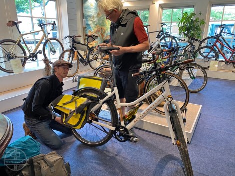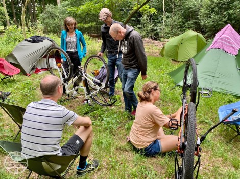 Op zaterdag begon de dag met een cursus fietsonderhoud voor beginners. Een band plakken, remblokjes vervangen en het correct terugplaatsen van een achterwiel met tandriem en Rohloff-naaf. Michiel legde het uit en daarna gingen de deelnemers zelf aan de slag.